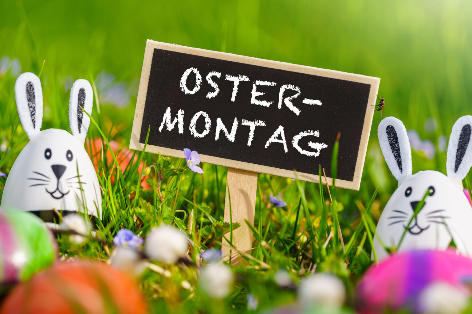 Ostermontag ist ein gesetzlicher Feiertag und markiert den Abschluss des Osterfestes. Dieses Osterbild zeigt eine Kreidetafel mit der Aufschrift Ostermontag, aufgestellt inmitten einer grünen Frühlingswiese. Dekorative Osterhasen aus bemalten Eiern und bunt gefärbte Ostereier umrahmen die Szene und unterstreichen die festliche Atmosphäre. Die warmen Farben und die natürliche Kulisse symbolisieren den Frühlingsanfang und die Ostertraditionen, die an diesem besonderen Tag Ostern Bild gefeiert werden.